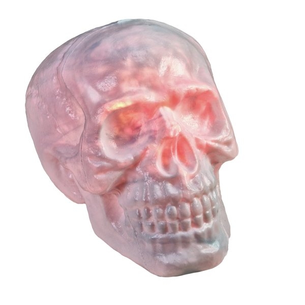 White skull with a red light inside which flikers and lights it up. A gruesome sound can be heard to make your themed or Halloween party even more scary.
