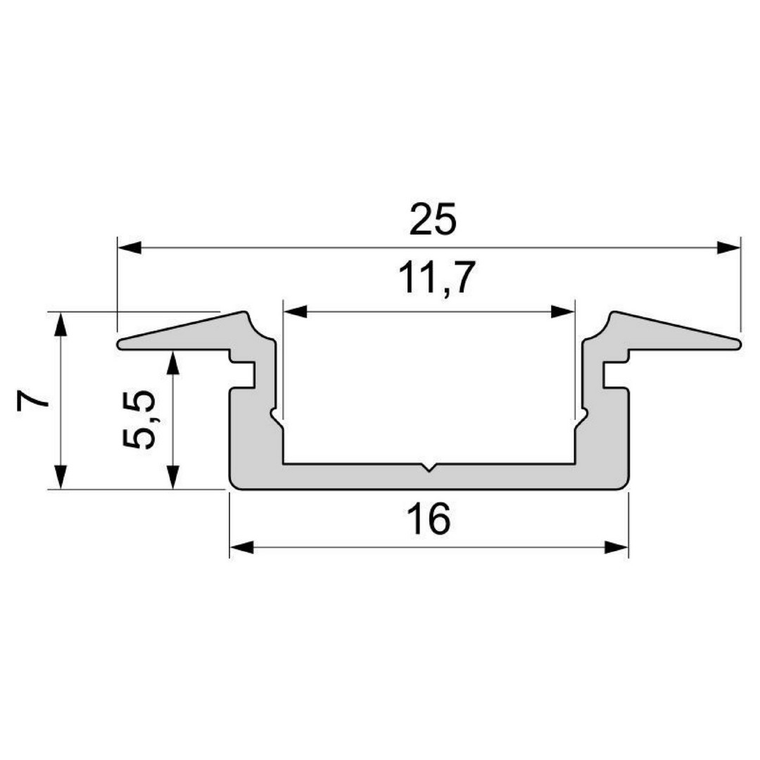 The Flat-T profile ET-01-10 is the perfect solution for flexible and rigid led strips from 5 to 11,7 mm width. Thanks to its small dimension 7x25mm it's the best solution to light interior spaces, wall, ceiling, floor, furniture, kitchen, display, shelves, fairs, advertising. Easy to install, it can be easily shortened by own work. It grants protection of Led strips by external influences and allows longer durability thanks to the internal passive cooling system. Mat-black brushed version RAL9005, 2 m.