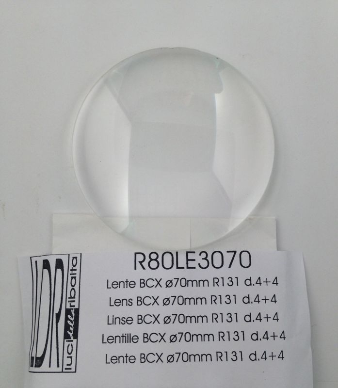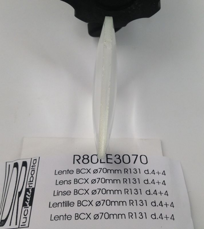Spare parts for front lens biconvex for Soffio 10/28 70W, Soffio 10/28 150W, Soffio 20/40 70W, Soffio 20/40 150W, Suono 10/28 plus, Suono 20/40 plus. Diameter: 70 mm, R131/131.
