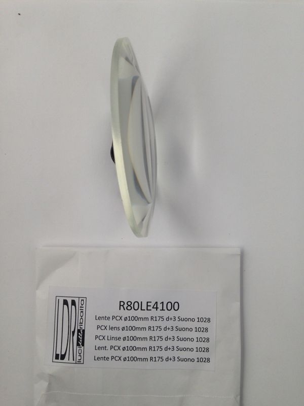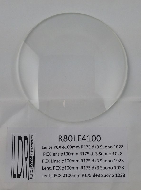 Spare parts for front lens plano convex for Soffio 10/28 70W, Soffio 10/28 150W, Suono d10/28, Suono 10/28 plus, Canto 250msd. Diameter: 100 mm, R175.
