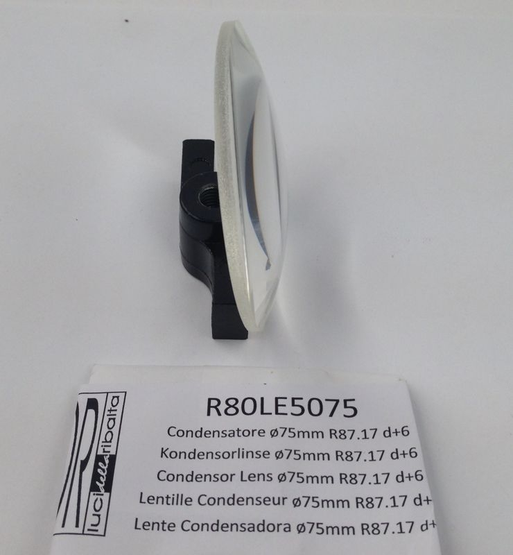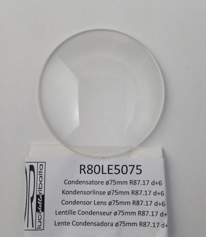 Spare parts for condensor lens for Soffio 10/28 70W, Soffio 10/28 150W, Soffio 20/40 70W, Soffio 20/40 150W, Suono d10/28, Suono d20/40, Suono 10/28 plus, Suono 20/40 plus, Canto 250msd. Diameter: 75 mm, R87,17.
