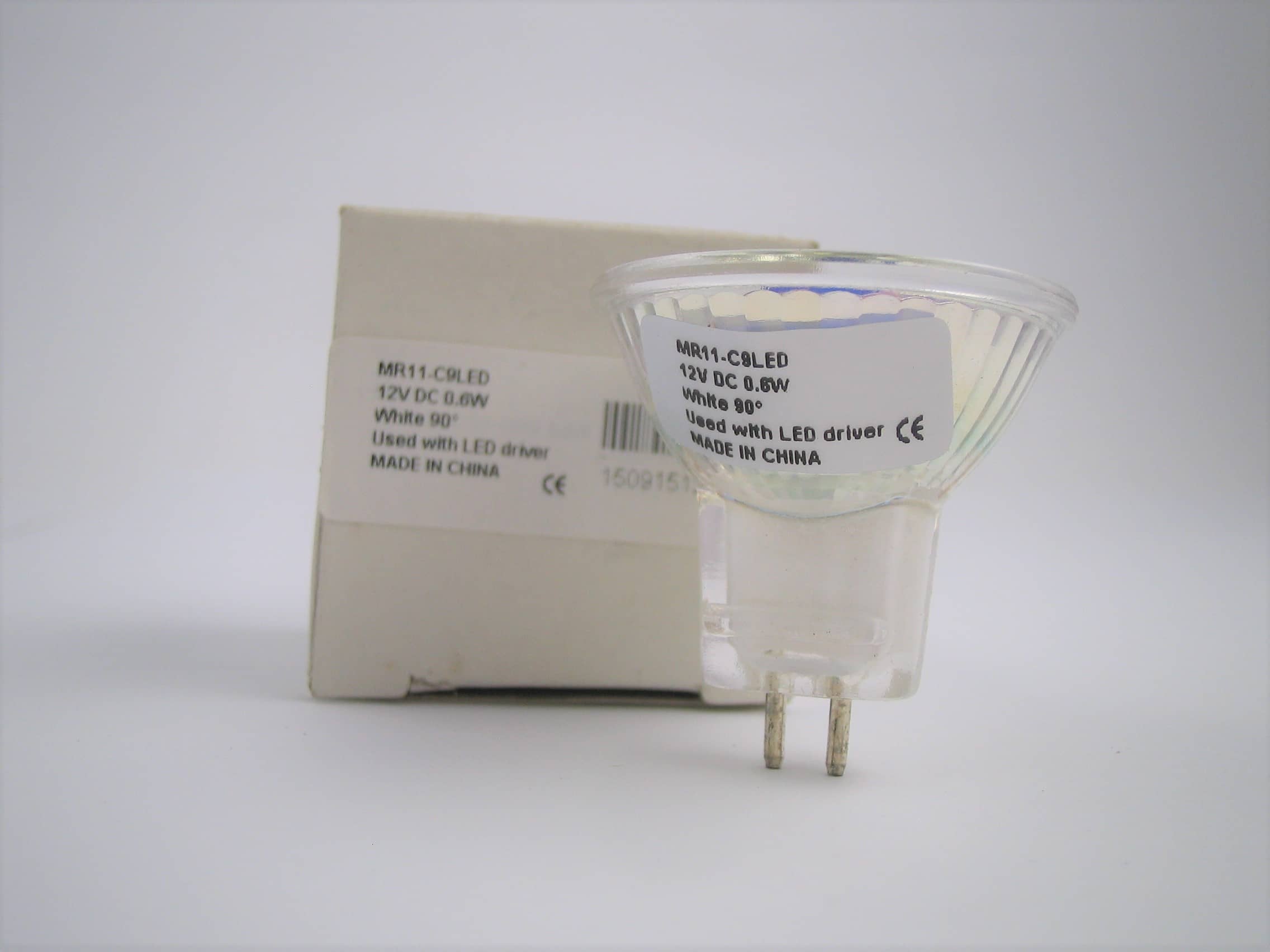 DICHRO LED MR11 is a small first generation LED lamp with 9 led with a diameter of 5mm available with a cold white colour between 4500 and 5000 K. It is the alternative to the 5W halogen lamp. It is ideal for scenographic use and details lighting. It is used for chromotherapy, parties such as Saint Valentains, Halloween, Christmas, Birthdays, Easter, Carnival.