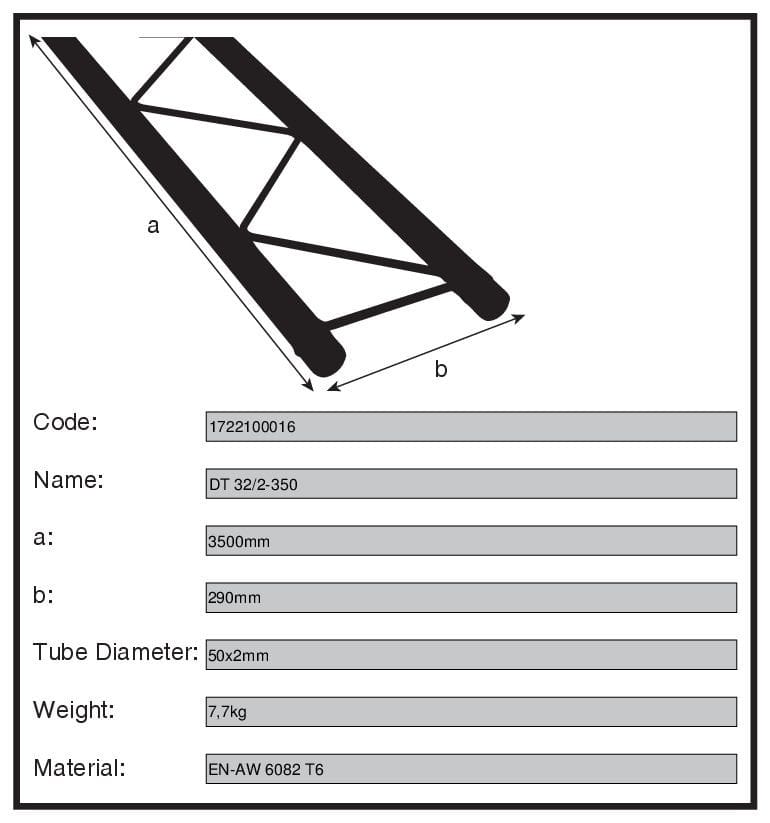The DT32 series is one of the most popular trussing systems duratruss has ever produced. The high load capacity combined with a very low weight are the features of this 29cm series with conical coupler. The advantage of the quick connector system lies in the fact that it closes force-locking the belt tube and allows rapid assembly and dismantling. The tubes are made of 50mm aluminum tube with a wall thickness of 2mm and give this system an outstanding strength -to-weight ratio. The struts have a diameter of 20 mm with a wall thickness of 2 mm. The system also includes cones, steel pins and safety clips. The system is from European production which is compatible to the most common systems in the market and is TÜV approved. Technical specs: