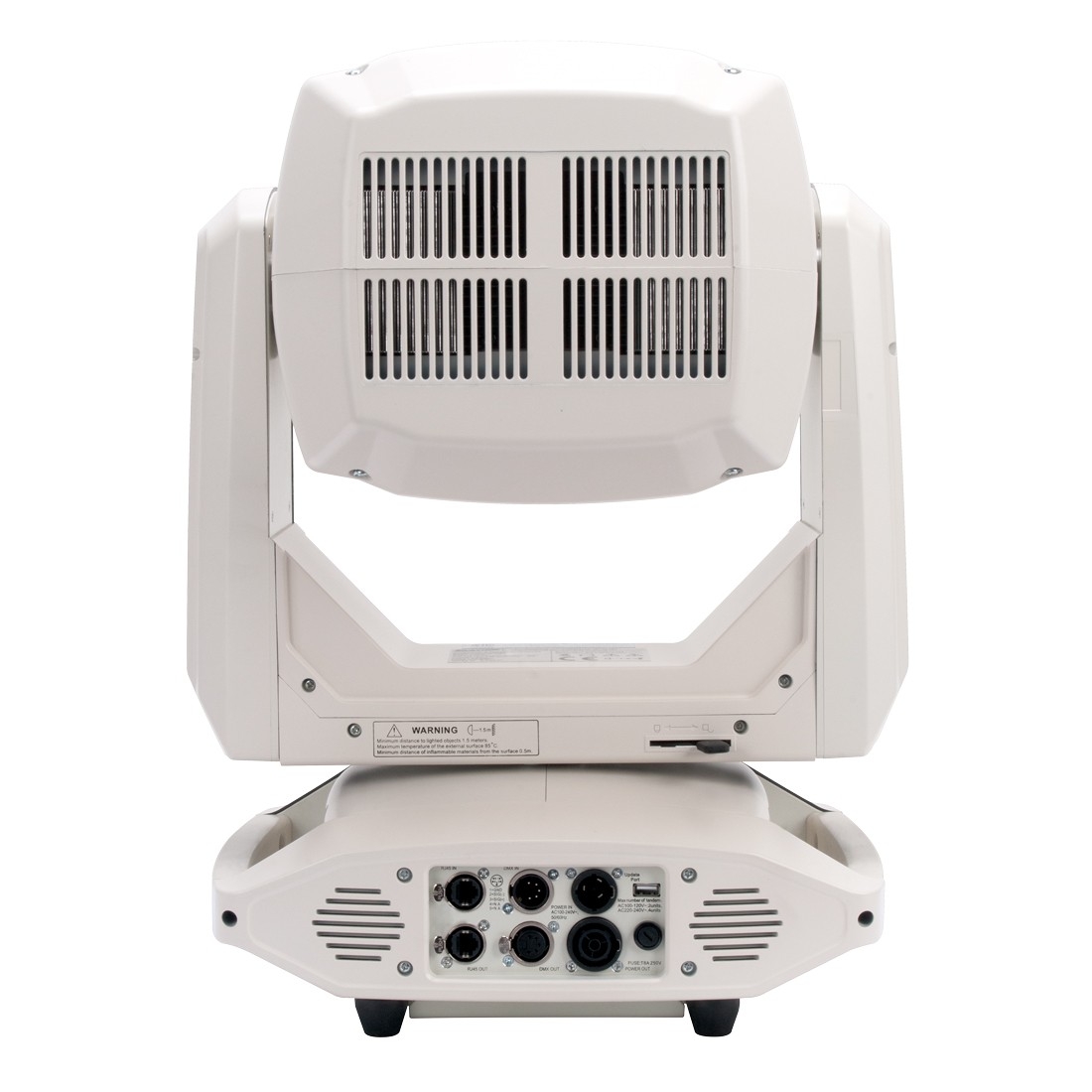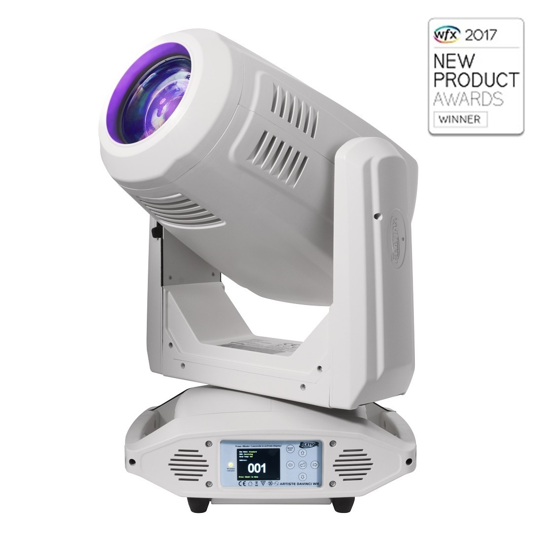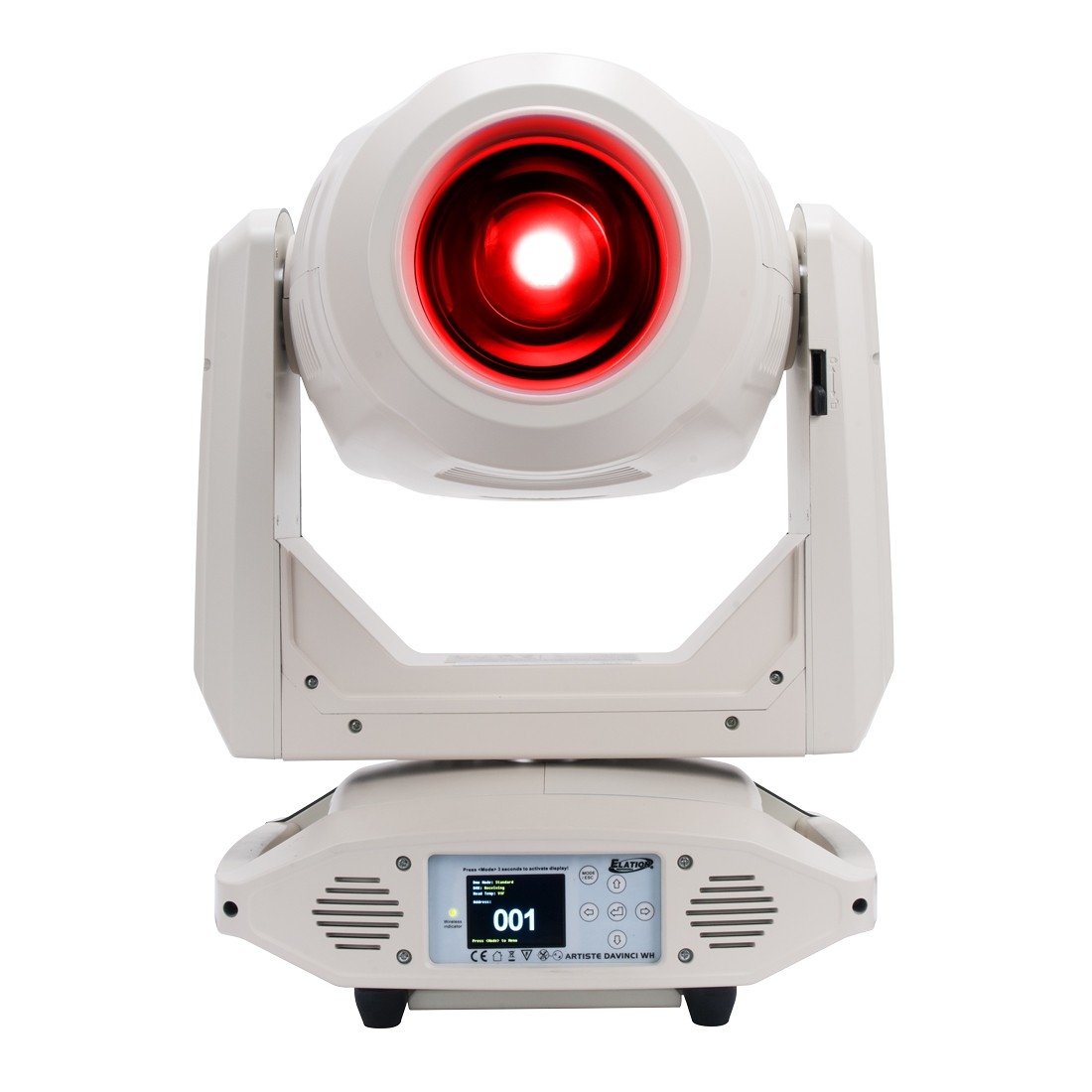 The Artiste DaVinci WH is an all white exterior housing version of the Artiste Davinci with a high powered LED spot luminaire featuring a 270W, 12,000 total lumen LED engine, 6° to 48° motorized zoom, full CMY color mixing plus linear CTO color correction, 7 dichroic colors including white (open), 6 rotating, interchangeable glass and metal gobos and 9 static-stamped gobos, 3-facet and linear rotating prisms, wash frost filter, motorized iris, bi-directional full 360˚ animation wheel, adjustable refresh frequency and gamma brightness, variable dimming curves, DMX, RDM (Remote Device Management), Art-NET and sACN (DMX over Ethernet) support, 5pin DMX in/out, RJ45 etherCON in/out and powerCON TRUE1 in/out connections, USB firmware upload port, an internal E-FLY wireless DMX receiver, flicker free operation for TV and Film, 6 button control full color 180° reversible menu display, 460W max power consumption and a multi-voltage universal auto switching power supply (100-240V)._x000D_