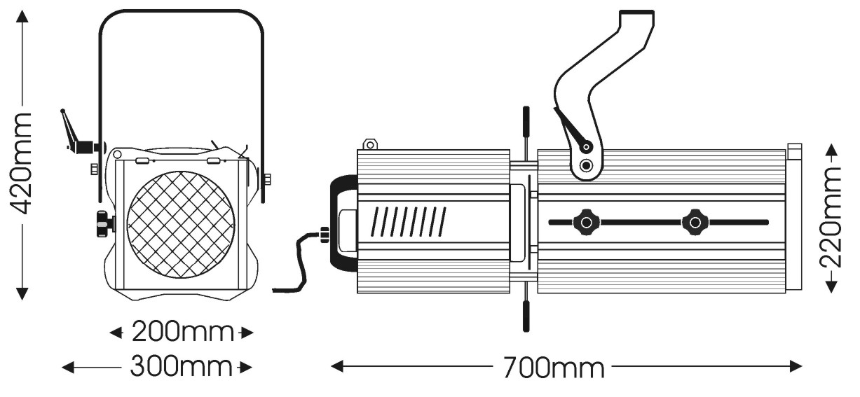 This wide-angle 1000/1200W profile black spotlight includes high-specification double condenser optical system for clean, crisp gobo projection. The comprehensive feature list includes: 18° - 36° zoom focus, rotating gate with 4 shutters, a cranked fork to accommodate acute overstage rigging angles and a double-microswitch interlock for safe lamp replacement. A colour frame, safety guard, 4 beam shutters and 2m mains cable are also included. available in black, white and silver.