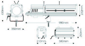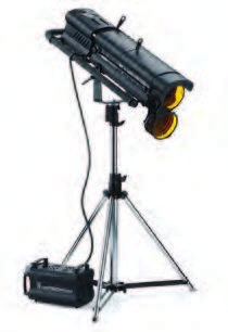 Discharge followspot for 1200W MSR lamp kit version. Includes: 1 followspot, colour changer, Philips lamp MSR 1200/2, black tripod with pivot, flight-case with wheels.