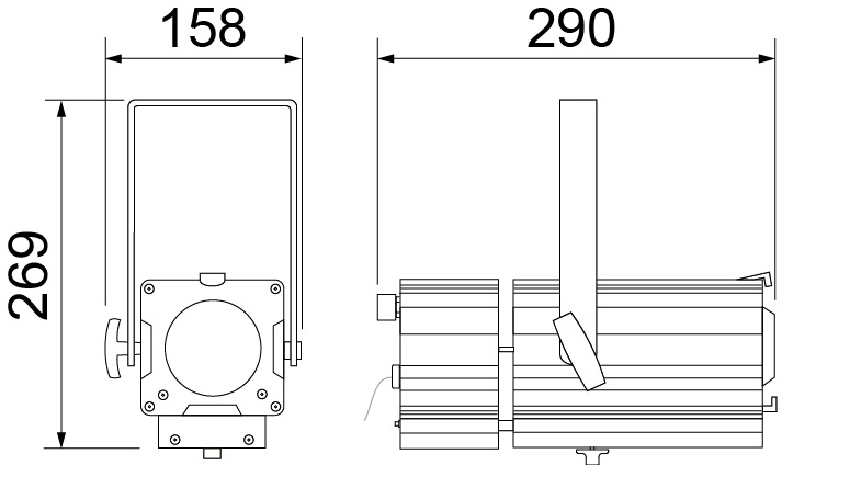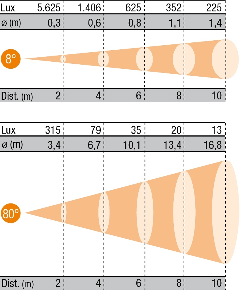 50W white LED Plano Convex spotlight, suitable for the most comprehensive uses. Adjustable beam from 8° to 80°. Source: LED warm White 3000K, Power: 50W, Control: DMX-RDM, Manuale, CRI: >90, Connectors: Cable without plug