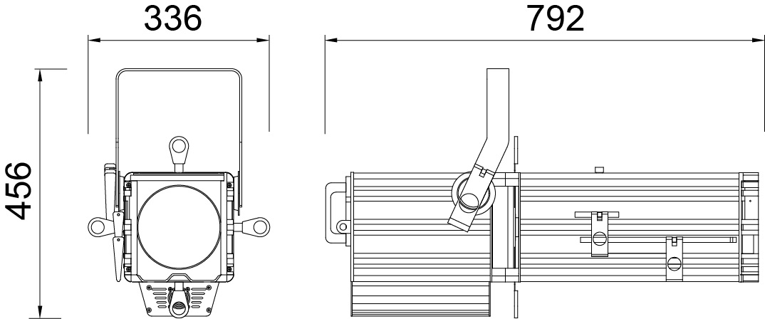 Aluminum housing for high heat dissipation by natural ventilation, adjustable forced ventilation, independent and removable shutter blades for beam shaping, filter frame lockable top cover, gobo-holder slot, soft and smooth lens focusing adjustment, yoke with clutch-locking system, adjustable yoke for fixture balancing