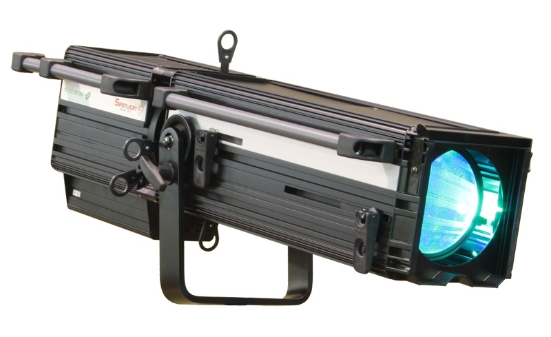 Aluminum housing for high heat dissipation by natural ventilation, adjustable forced ventilation, independent and removable shutter blades for beam shaping, filter frame lockable top cover, gobo-holder slot,