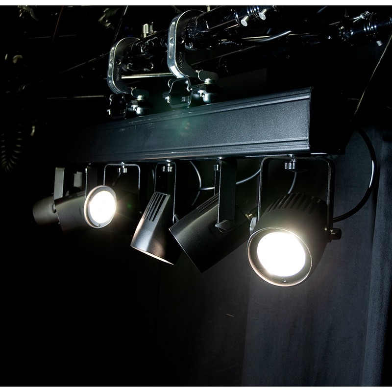 The Saber Bar 6 is a 6-head pinspot lighting system mounted on a 1-meter linear base with built-in power and DMX connections. Each pinspot is similar to the Saber Spot WW with a 15W Warm White LED (3100K) and an ACL lens that produces a razor sharp 4-degree beam. Each fixture’s X/Y axis may be individually adjusted manually for precision angling of the beams. There are two heavy duty adjustable brackets to mount the fixture to a ceiling or truss. The rear panel features a display with function buttons, 3-pin and 5-pin DMX In/Out to link data and power locking In/Out connections to daisy chain power. There are multiple DMX channel modes to choose from, built-in programs and 6 dimming curve modes. The Saber Bar 6 is s ideal for performance stages, installations, table spotting and lighting in retail stores.