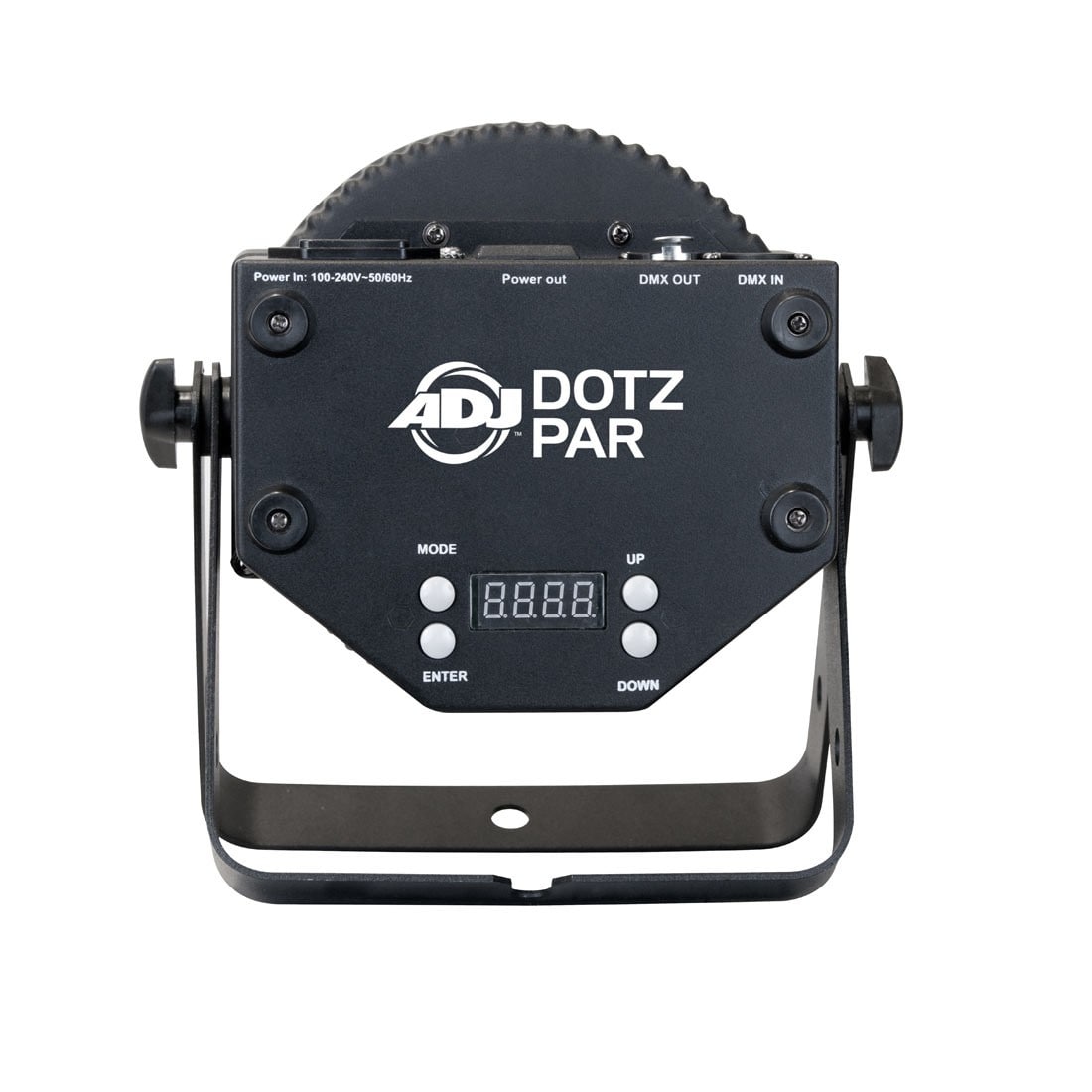 Specifications: - High output slim low profile Par fixture with one TRI (3-IN-1) RGB COB LED; - COB Technology (Chip On Board) produces powerful, smooth RGB color mixing with rich palettes of color; - Use as Wash/par or Pixel Mapped for a stunning visual effect; - 5x Operational modes: Auto Run, Sound Active, Color Macro, Dimmer, and DMX Controlled Mode; - 4 DMX channel modes: 3, 4, 5 or 9 channel; - Intelligently designed, patent pending power, DMX Ins/Outs sit sideways so the unit can be set flat on the ground or set inside truss; - Built-In preset colors and programs; - Flicker Free operation (No flickering on camera); - 35 built-in Color Macros; - LED pulse and strobe effect; - Electronic Dimming: 0 - 100%; - 5 selectable Dim Curves (Standard, Stage, TV, Architectural, Theatre); - Beam angle: 60° (25° with supplied lens kit); - 3-pin XLR chassis mount connectors for DMX linking; - IEC AC IN/OUT to daisy chain power (up to 13 Dotz Pars @ 110V and 28 Dotz Pars @ 230V); - Power Draw: 36W total (All LEDs @ Full On); - 4-button LCD DMX display on rear panel; - Compatible with ADJ Dotz RF wireless remote control (sold separately); - Single yoke allows fixture to be mounted; - Light Source: 1x 36-Watt COB TRI LED (RGB: 3-IN-1, rated at approximately 50,000 hrs); - Auto sensing power supply: AC 100V/60Hz - 240V/50Hz; - Dimensions (LxWxH): 209 x 222 x 114mm (with bracket); 165 x 165 x 114mm (without bracket); - Weight: 2 kg. Specifications subject to change without notice.