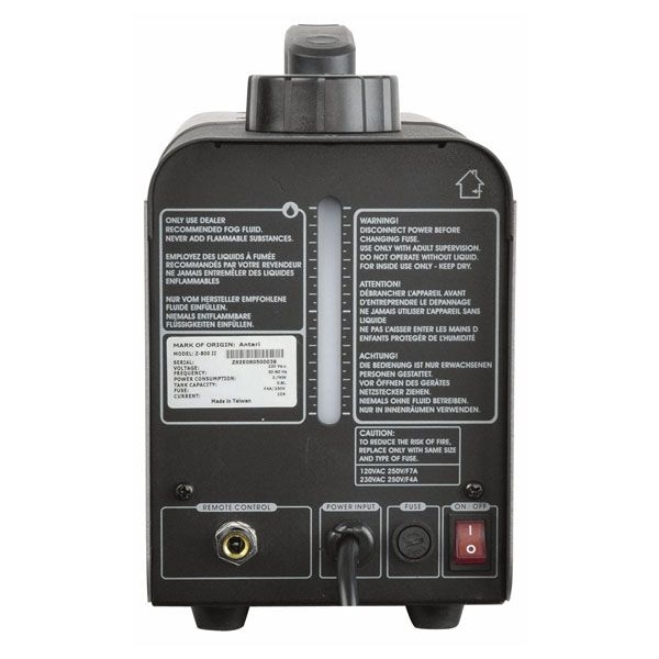 Antari Z-800MKII è controllabile in modalità wireless, temporizzatore o stand-alone. L'uscita è costante. Con un rapido tempo di riscaldamento di soli 100 secondi, il dispositivo Z-800MKII produce una quantità continua e costante di fumo per tutto il tempo necessario. Il fumo è atossico, pulito e inodore e non lascia residui all'interno del riscaldatore. Inoltre, il riscaldatore interno a spirale è fabbricato in acciaio inossidabile ad alta tecnologia, che fornisce il più efficace trasferimento di energia termica. Con il suo sistema di controllo della potenza ad alta efficienza, la macchina del fumo opera a basso livello di temperatura, con un risparmio del 20% di energia elettrica.
