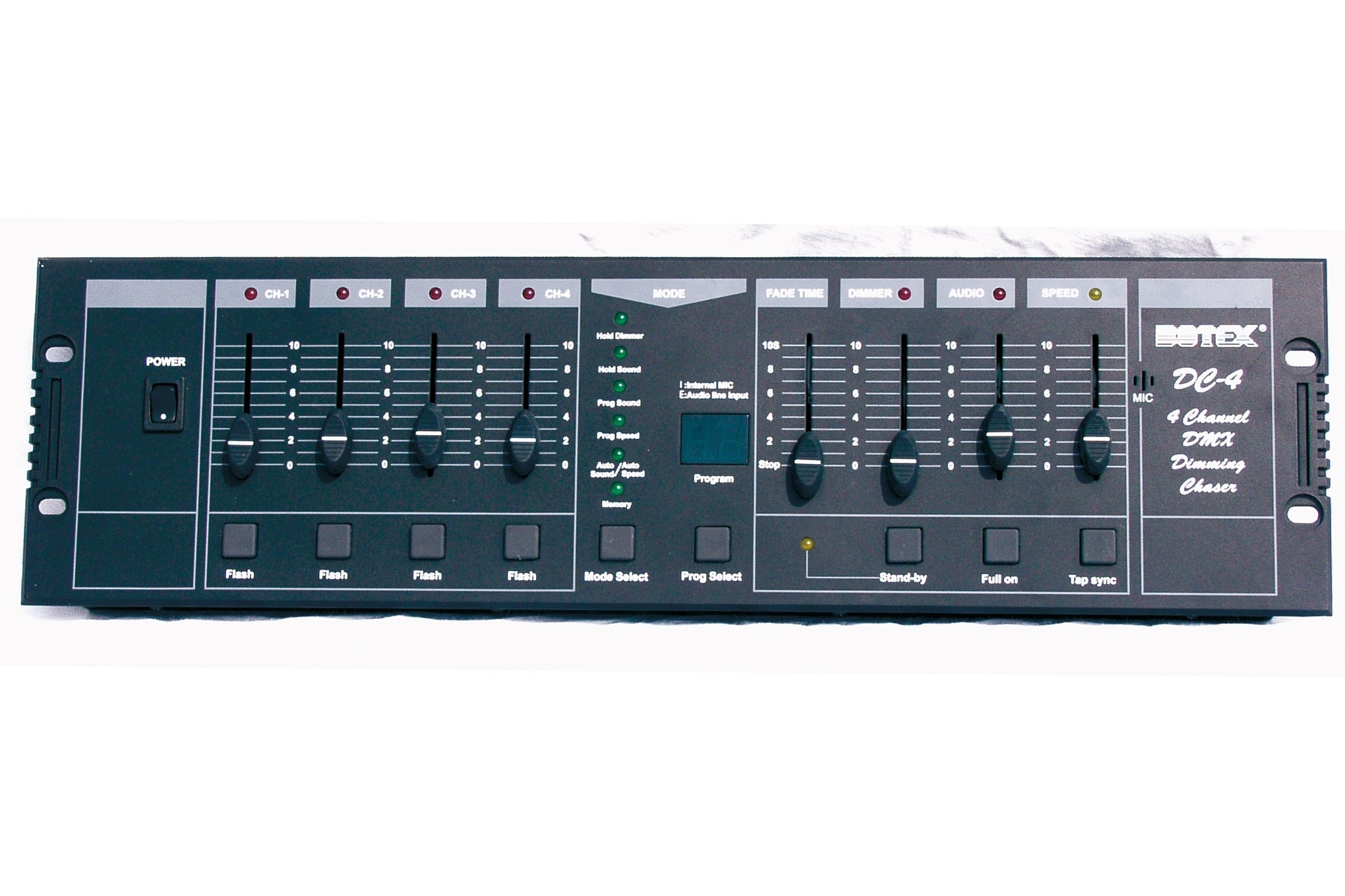 Il DC-4P è il sistema più compatto e semplice da utilizzare in situazioni fisse e mobili. Il DC-4P è un centralino con 42 scene già memorizzate con la possibilità di eseguirle in modalità automatica o sonora regolando l'intensità del microfono, la velocità delle scene e il "FADE TIME". Si può utilizzare anche in modalità manuale grazie ai fader per ogni canale e ai tasti flash. Questa versione è caratterizzata dalle presenza di prese Schuko e connettore multipin 6 poli per connettere facilmente Par cans o 4 barre con connessione multi-pin. Dati tecnici: