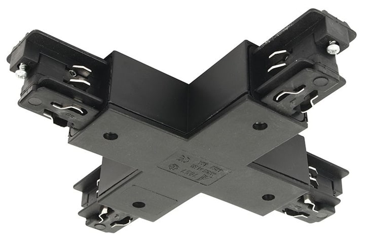 Connettore a X con possibilità di alimentazione, nero per binario quadrato. Codice ivela: 7657-10-W30. Dettagli tecnici: