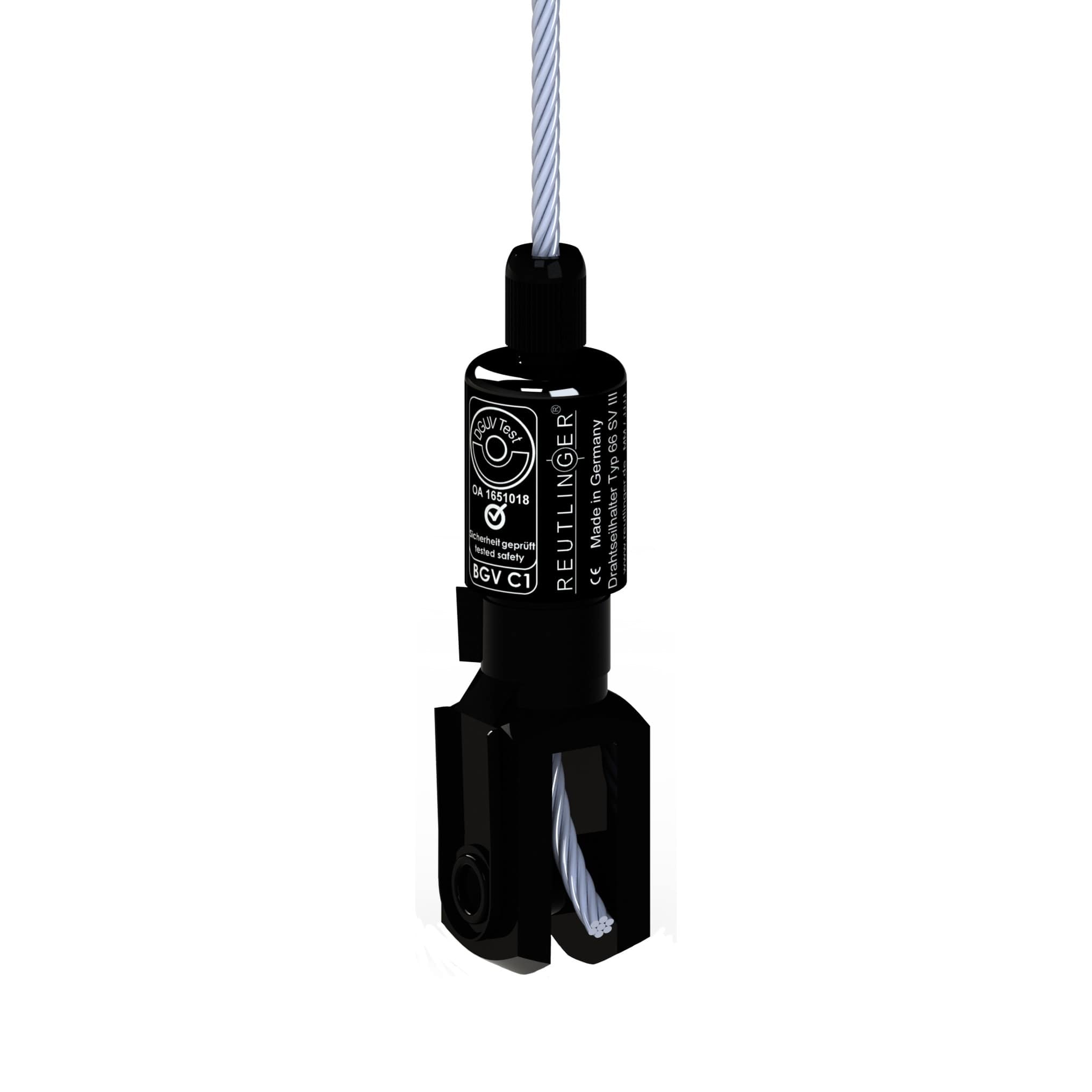 Il supporto per fune metallica con uscita cavo centrale, cavallotto 16x32, dado di bloccaggio, uscita cavo laterale e meccanismo di presa a sei sfere è certificato TÜV e ha anche il certificato di prova per l'uso nell'ambito di applicazione DGUV regolamento 17 (BGV C1). Specifiche: