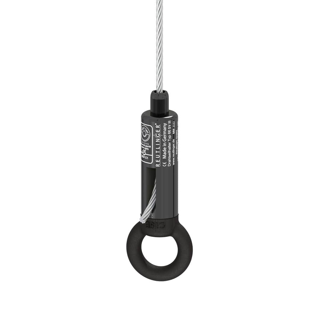 Il supporto per fune metallica con anello ed uscita cavo laterale, dado di bloccaggio, uscita cavo laterale e meccanismo di presa a sei sfere è certificato TÜV e ha anche il certificato di prova per l'uso nell'ambito di applicazione DGUV regolamento 17 (BGV C1). Specifiche: