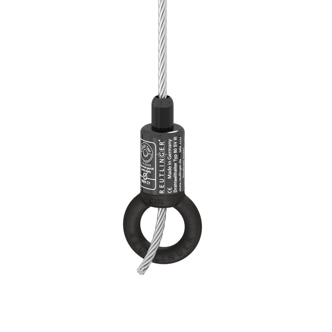 Il supporto per fune metallica con uscita cavo centrale, anello completo M20, dado di bloccaggio, uscita cavo laterale e meccanismo di presa a sei sfere è certificato TÜV e ha anche il certificato di prova per l'uso nell'ambito di applicazione DGUV regolamento 17 (BGV C1). Specifiche: