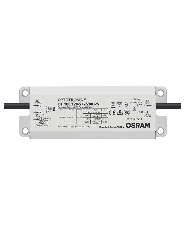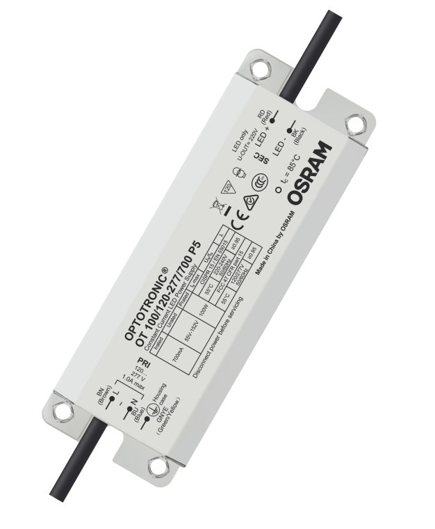 Utilizzato per l'illuminazione stradale e urbana, l'industria e per gli apparecchi di illuminazione con classe di protezione I, questo Alimentatore Optotronic consente un'elevata protezione contro picchi di tensione fino a 6 Kv.