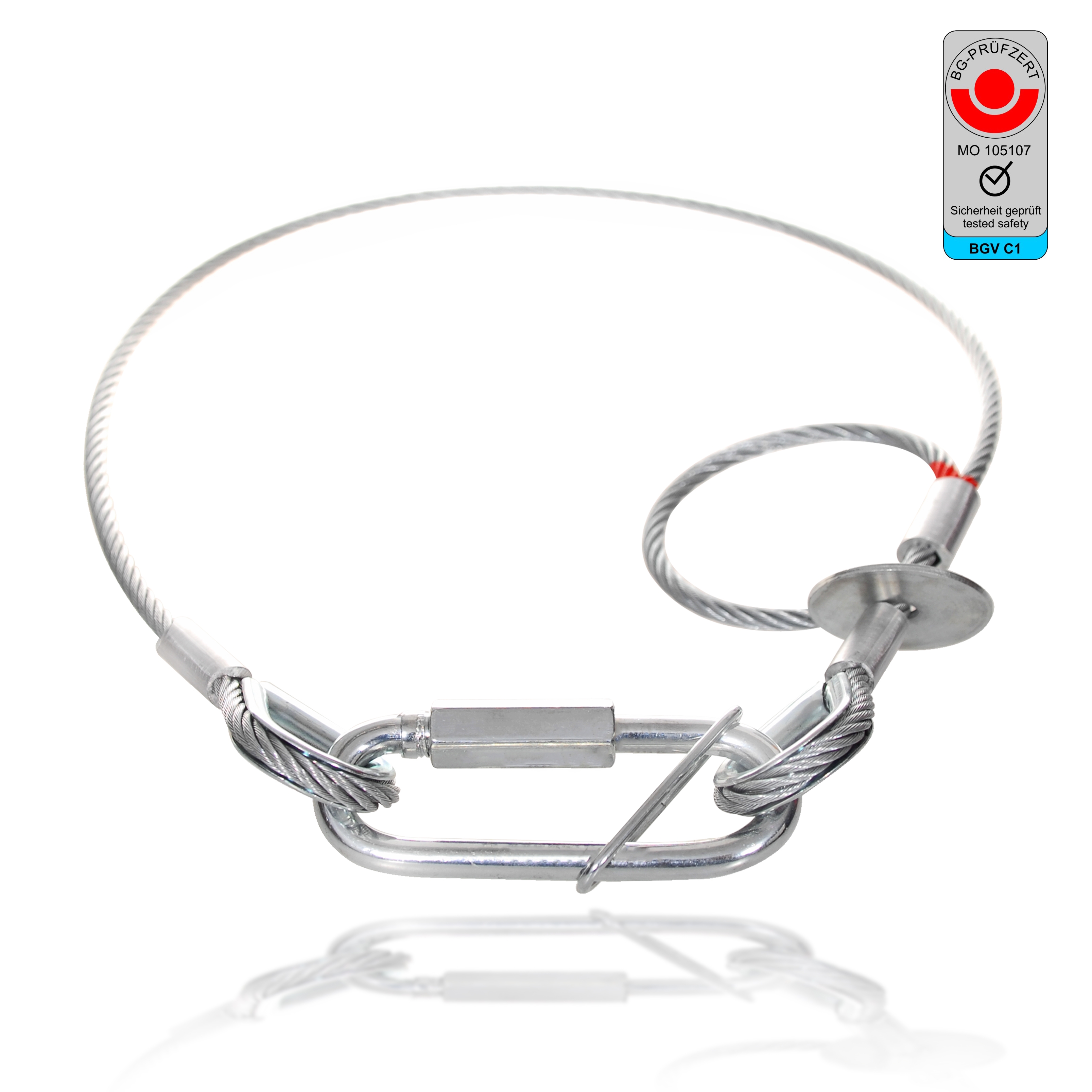 Cavo di sicurezza con certificato di collaudo BG. La fune di sicurezza è dotata di una placca permanente con tutti i dati importanti. Nell'applicazione, si ricorda di non superare un'altezza max. di 20 cm di caduta.