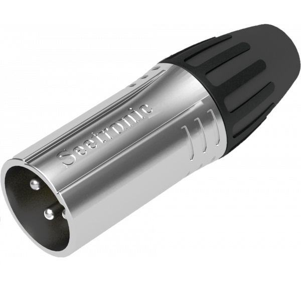 Connettore XLR 3-poli maschio con corpo in metallo, per una lunga durata e alta affidabilità.