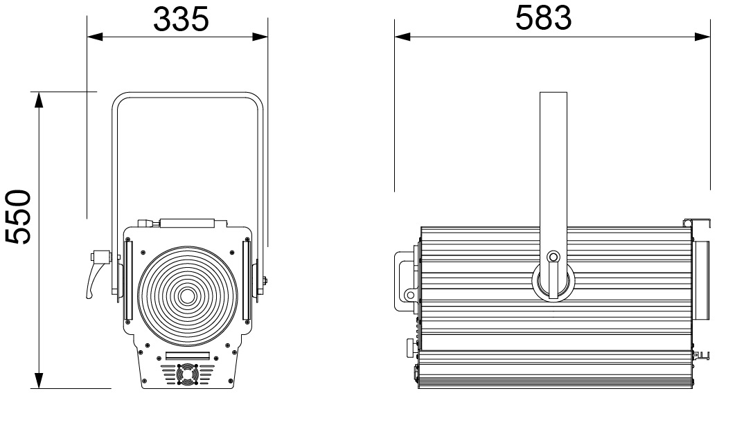 Proiettore a led dotato di lente Fresnel con regolazione del fascio da spot a flood a bordi sfumati. Consigliato per l'illuminazione direzionale morbida e uniforme. Disponibile nella versione con controllo motorizzato o con comando a palo. Serie Green Line. Sorgente: LED Bianco Freddo 5600K, Potenza: 450W, Controllo: DMX-RDM, Connettori: Powercon® In&Out, Tensione di alimentazione:90-260V, 50-60Hz, Peso: 14 Kg, Dimensioni: 440mm x 745mm x 510mm