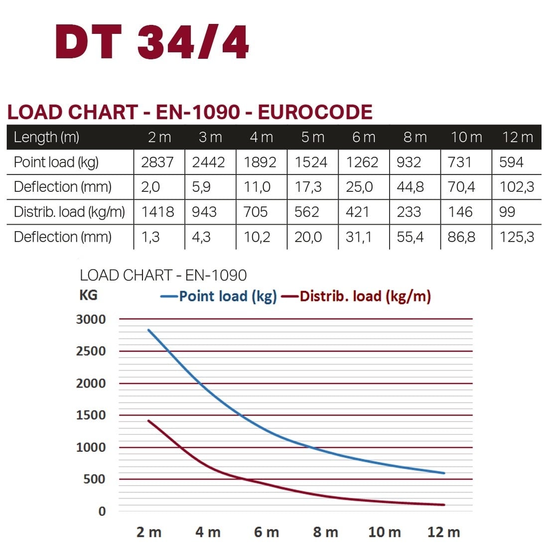 La serie DT34 è uno dei più popolari sistemi a traliccio prodotti da Duratruss. L'alta capacità di carico combinata con la sua leggerezza rappresentano le caratteristiche principali di questa serie da 29 cm con doppio cono. Il vantaggio del sistema a connettore rapido risiede nel fatto che permette un veloce montaggio e smontaggio e maggior portata in lunghezza quando si realizzano americane o ring. I 4 tubi sono realizzati in alluminio da 50 mm con uno spessore di parete di 2 mm. Il sistema comprende anche coni, punte in acciaio e clip di sicurezza. Esso è inoltre di origine Europea e quindi compatibile con i principali sistemi venduti ed è approvato TUV. Specifiche tecnice: